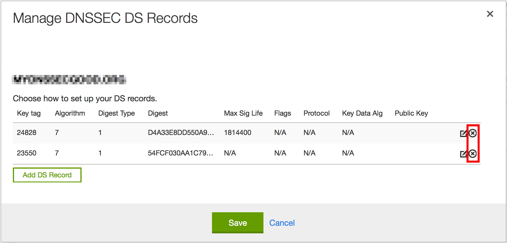 Otherwise, DS records can be removed via the registrar. Below is an example showing how to remove DS records using the GoDaddy web-based interface:
